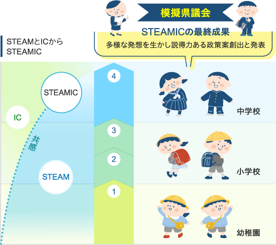中学校の最終学年(3年生)ではこれらが統合されたSTEAMICの最終成果として、政策案創出と模擬県議会での発表を行う。