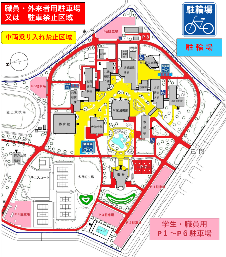 P7、P8駐車場は、職員・外来者用です。学生は使用できません。